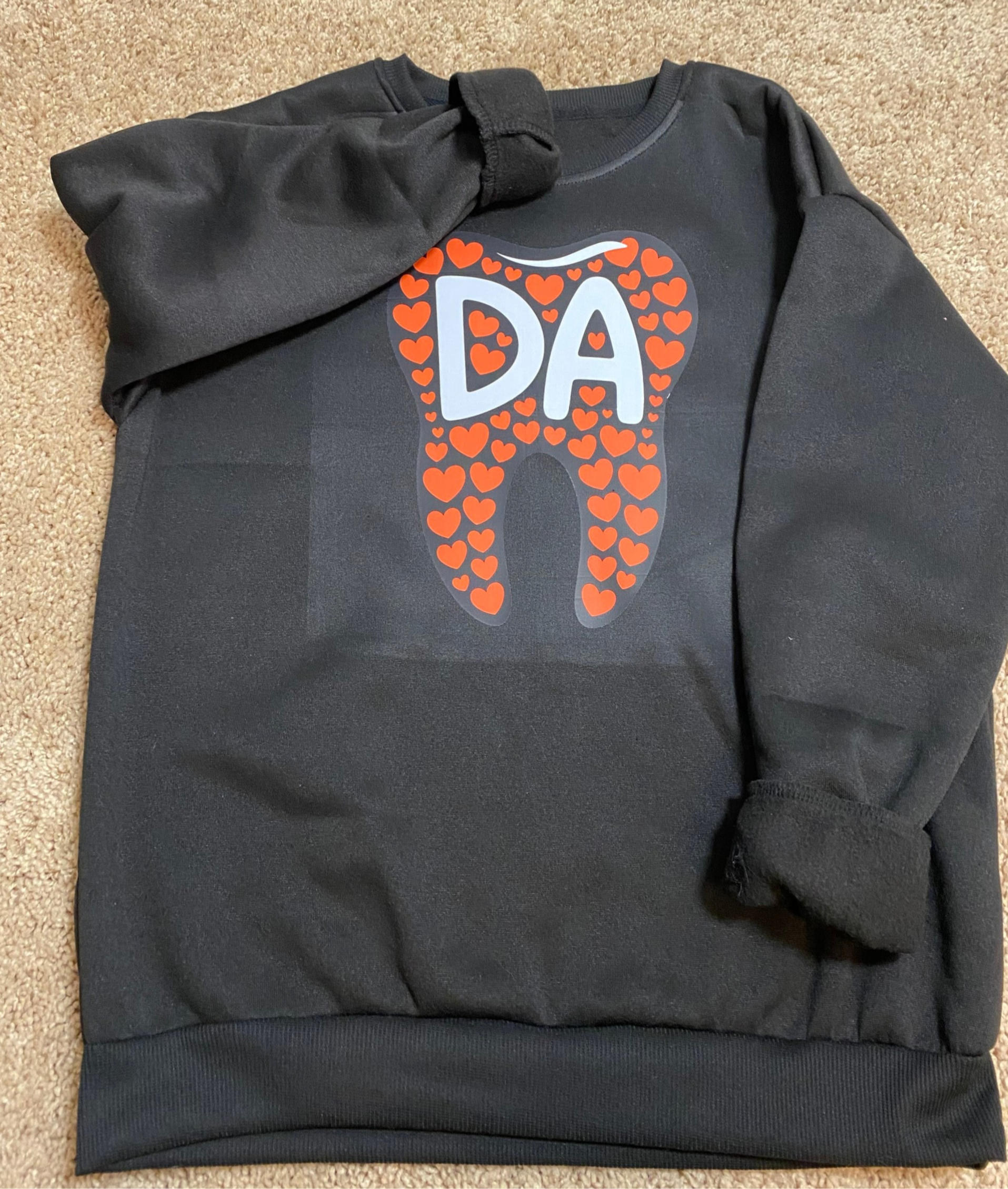 Black pullover dental assistant sweatshirt with tooth logo filled with hearts.